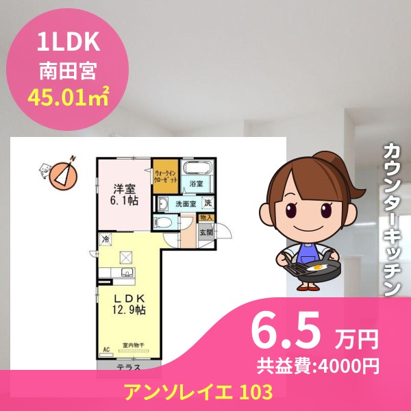 月額賃料は6.5万円で、共益費は4000円です