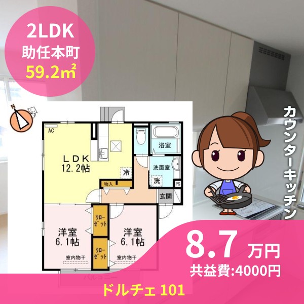 助任緑地が420mにあり、最寄りのスーパーはフジで徒歩5分、セブンイレブンも徒歩7分です。