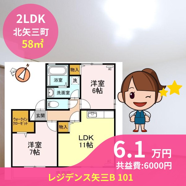 月額賃料は6.1万円で、共益費は6000円です