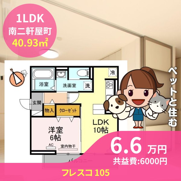 月額賃料は6.6万円で、共益費は6000円です