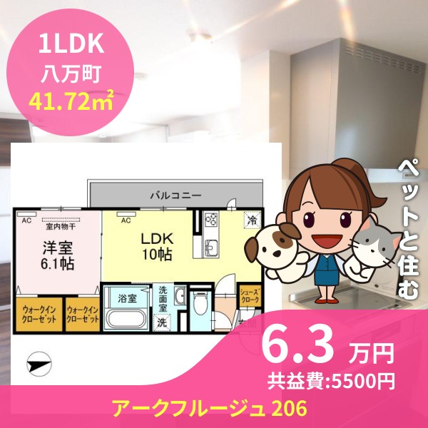 月額賃料は6.3万円で、共益費は5500円です