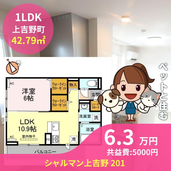 吉野川河川敷緑地が360mにあり、最寄りのスーパーはフジで徒歩9分、ローソンも徒歩9分です。