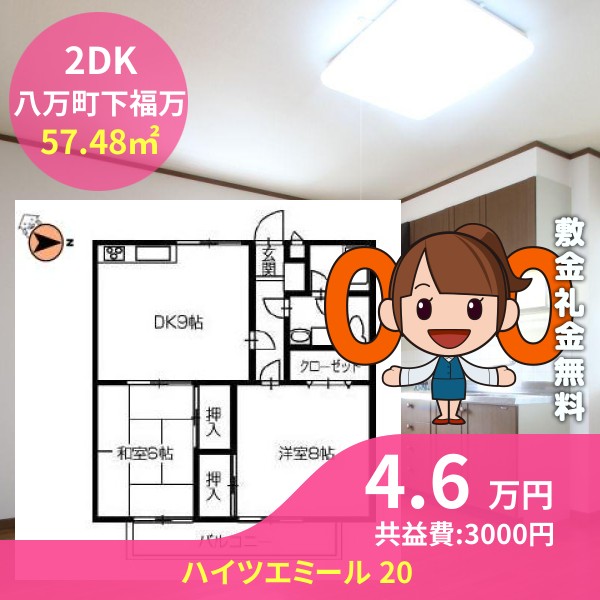 間取りは2DKで57.48㎡の広さです