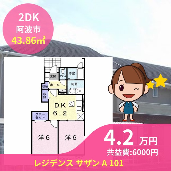 月額賃料は4.2万円で、共益費は6000円です