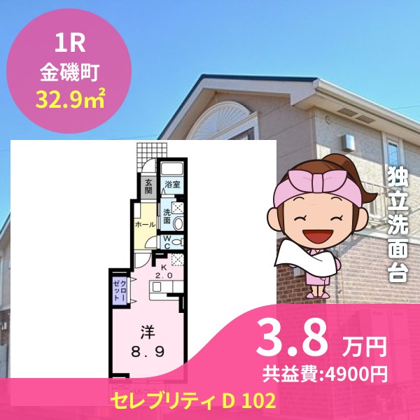 月額賃料は3.8万円で、共益費は4900円です