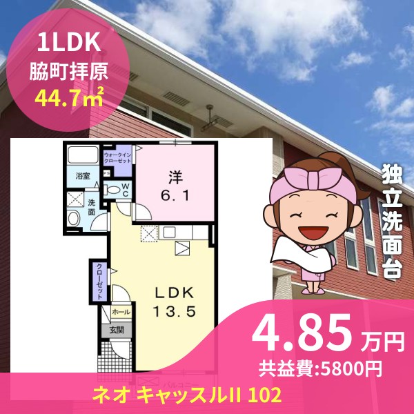 間取りは1LDKで44.7㎡の広さです