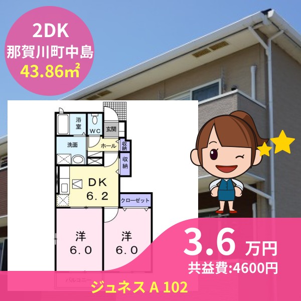間取りは2DKで43.86㎡の広さです