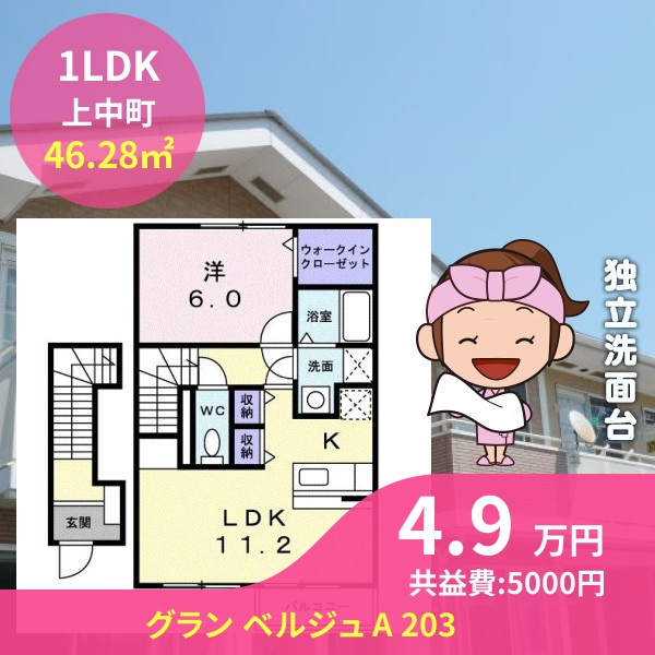 間取りは1LDKで46.28㎡の広さです