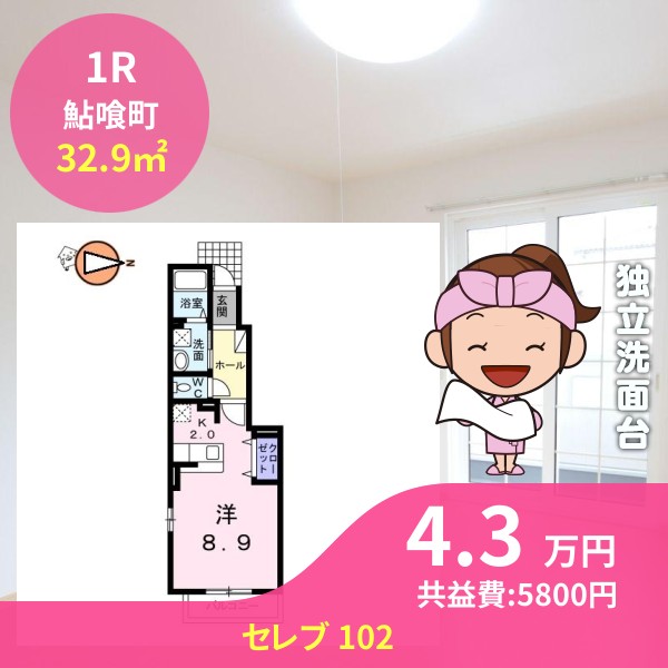 月額賃料は4.3万円で、共益費は5800円です