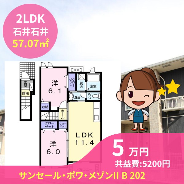 間取りは2LDKで57.07㎡の広さです