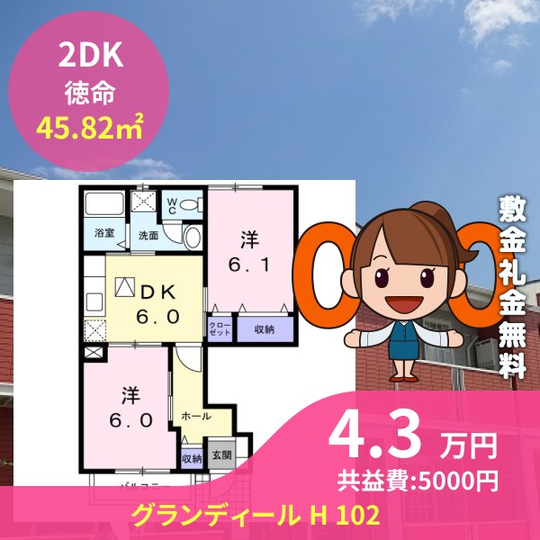 月額賃料は4.3万円で、共益費は5000円です