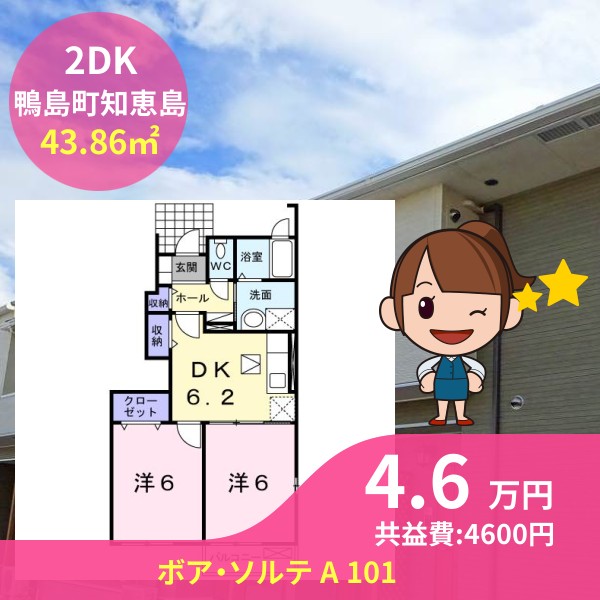 間取りは2DKで43.86㎡の広さです