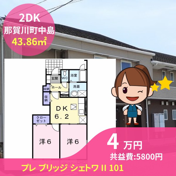 間取りは2DKで43.86㎡の広さです