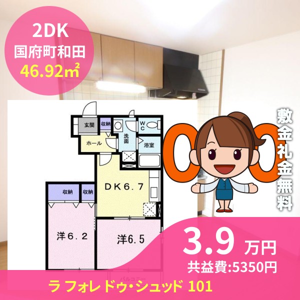月額賃料は3.9万円で、共益費は5350円です