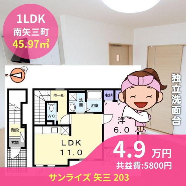 間取りは1LDKで45.97㎡の広さです