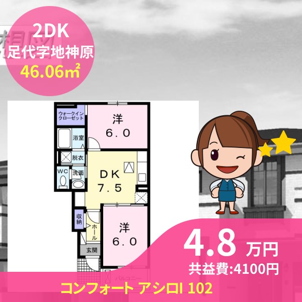 月額賃料は4.8万円で、共益費は4100円です
