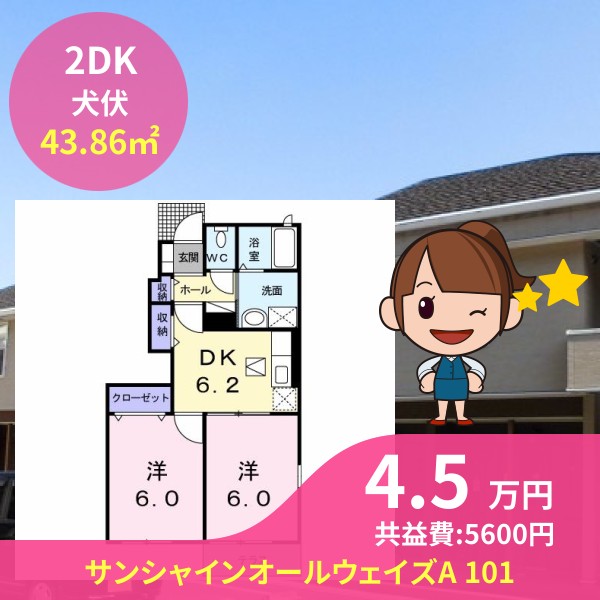 間取りは2DKで43.86㎡の広さです