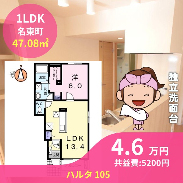 月額賃料は4.6万円で、共益費は5200円です