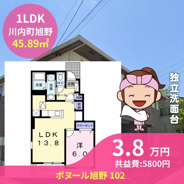 月額賃料は3.8万円で、共益費は5800円です