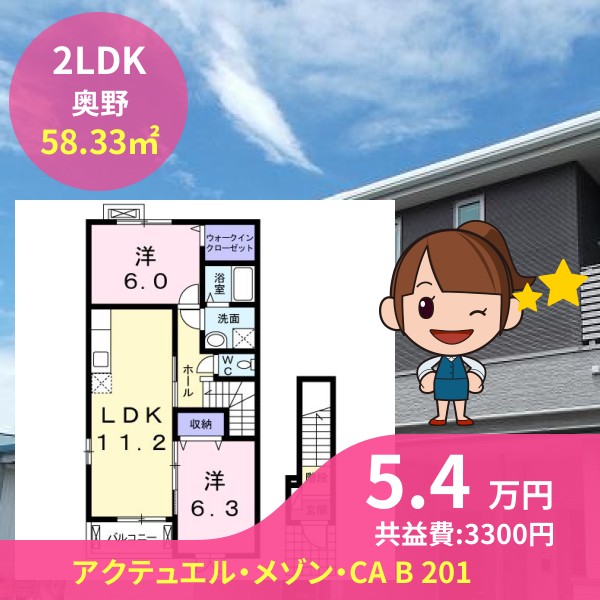 月額賃料は5.4万円で、共益費は3300円です