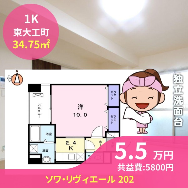 月額賃料は5.5万円で、共益費は5800円です