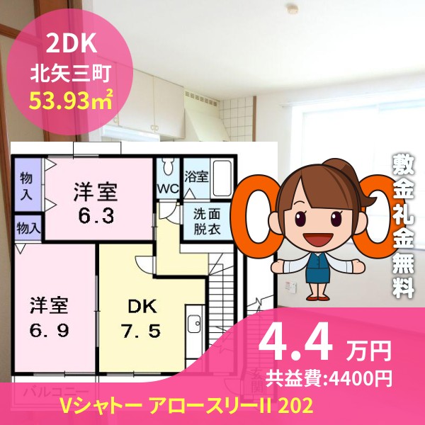 月額賃料は4.4万円で、共益費は4400円です