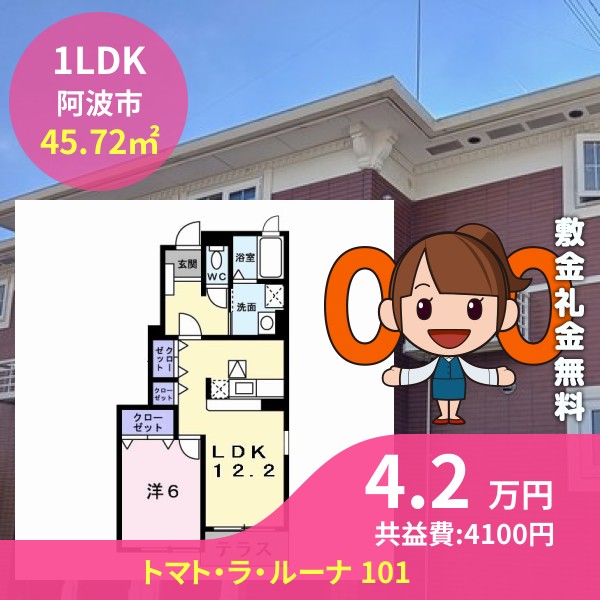 月額賃料は4.2万円で、共益費は4100円です