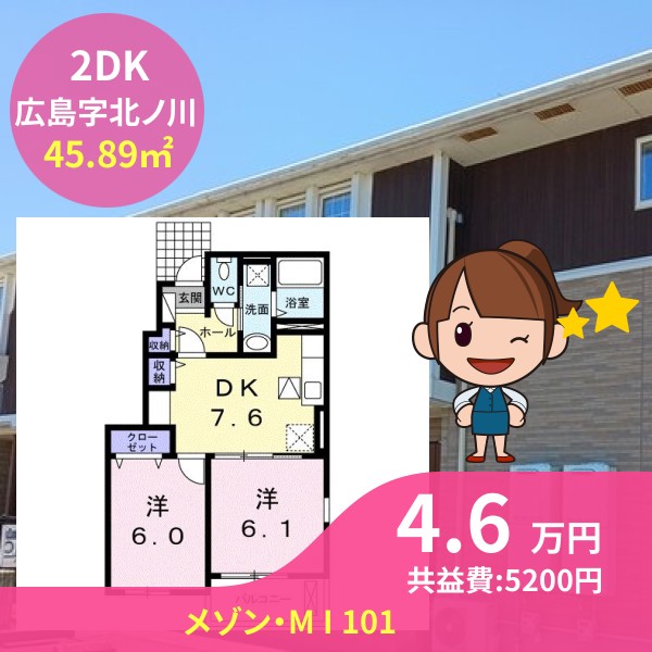 間取りは2DKで45.89㎡の広さです