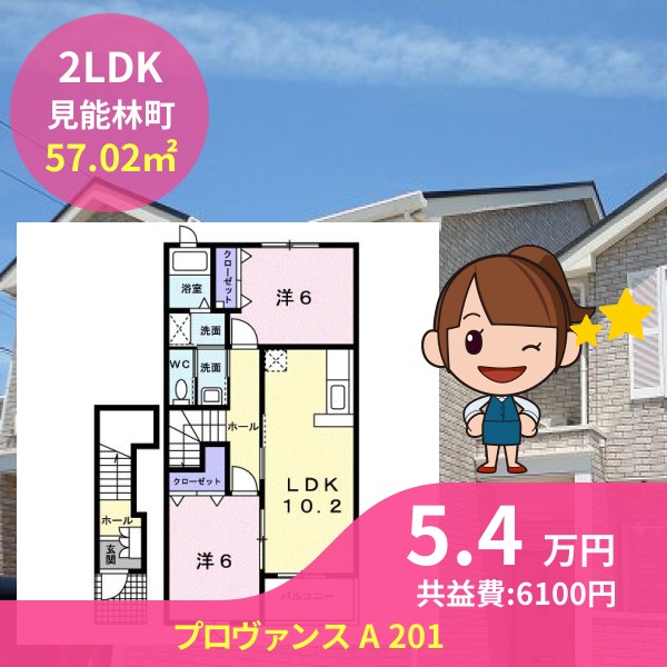 月額賃料は5.4万円で、共益費は6100円です