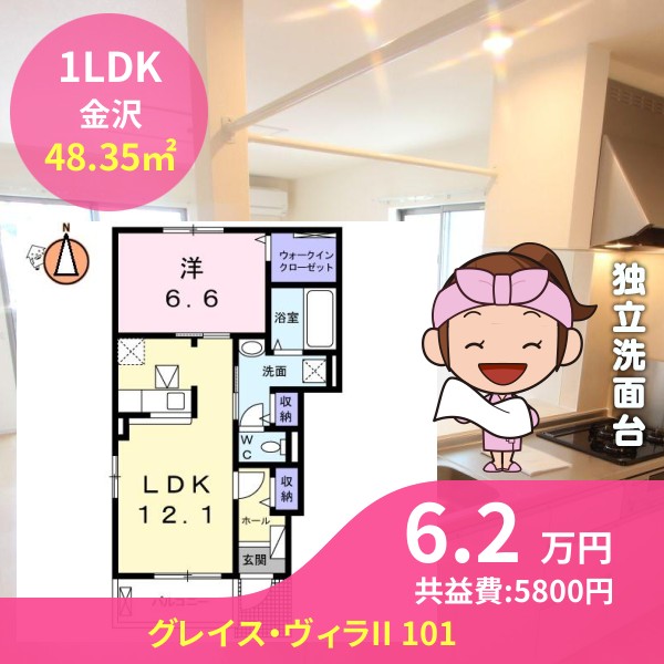 女性に特に喜ばれる独立洗面台のあるお部屋です