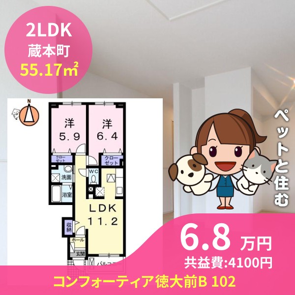 徳島市蔵本町のコンフォーティア徳大前B 102をご紹介します