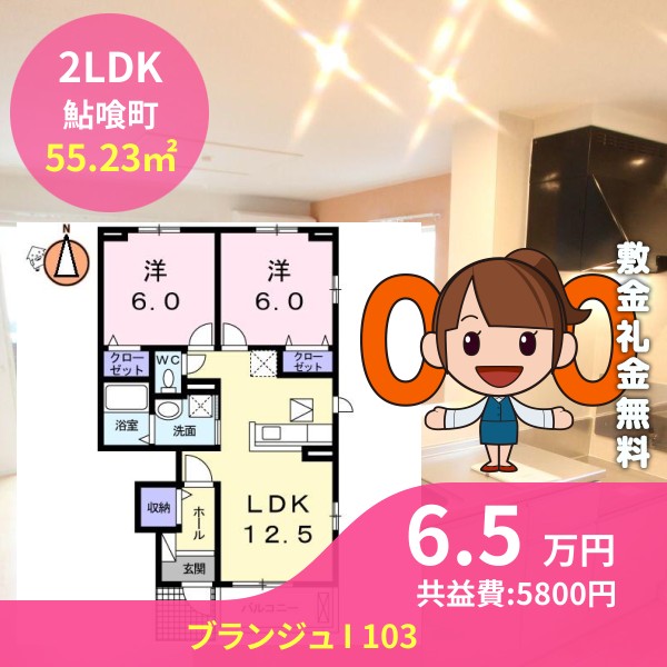 月額賃料は6.5万円で、共益費は5800円です