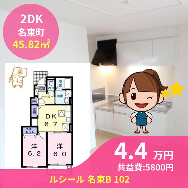 月額賃料は4.4万円で、共益費は5800円です