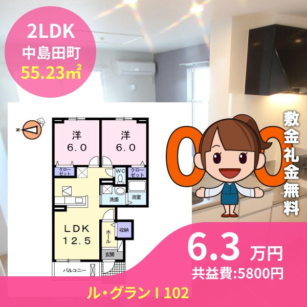 月額賃料は6.3万円で、共益費は5800円です