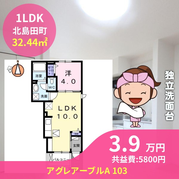 月額賃料は3.9万円で、共益費は5800円です