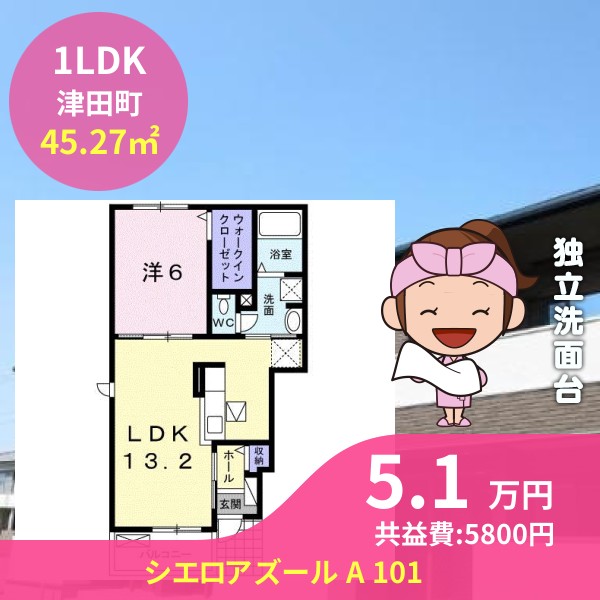 月額賃料は5.1万円で、共益費は5800円です