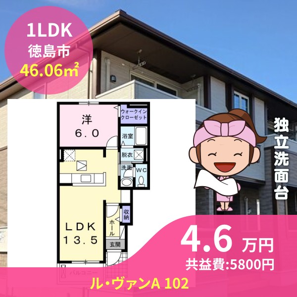 月額賃料は4.6万円で、共益費は5800円です