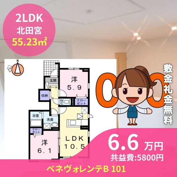 月額賃料は6.6万円で、共益費は5800円です