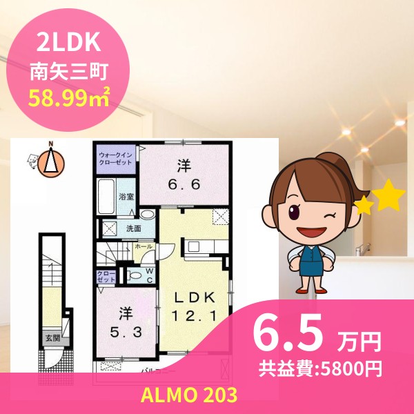 月額賃料は6.5万円で、共益費は5800円です