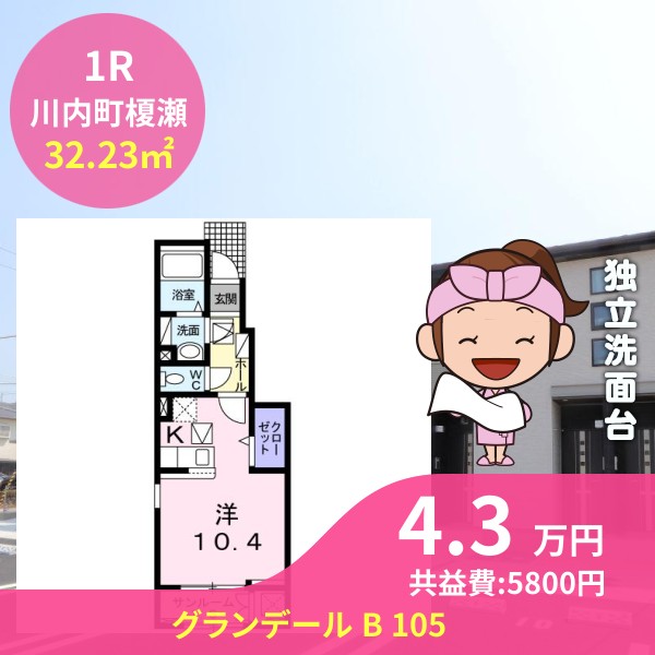月額賃料は4.3万円で、共益費は5800円です