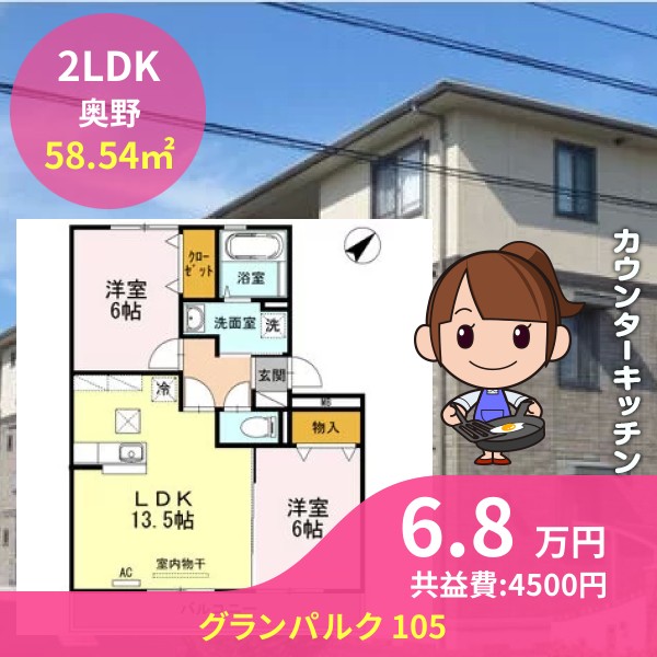 月額賃料は6.8万円で、共益費は4500円です